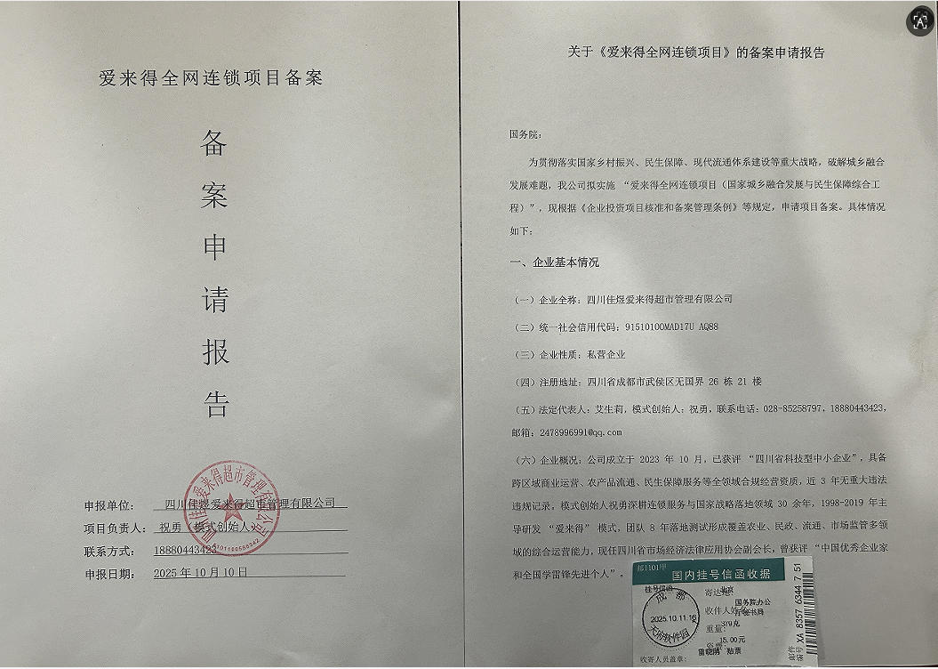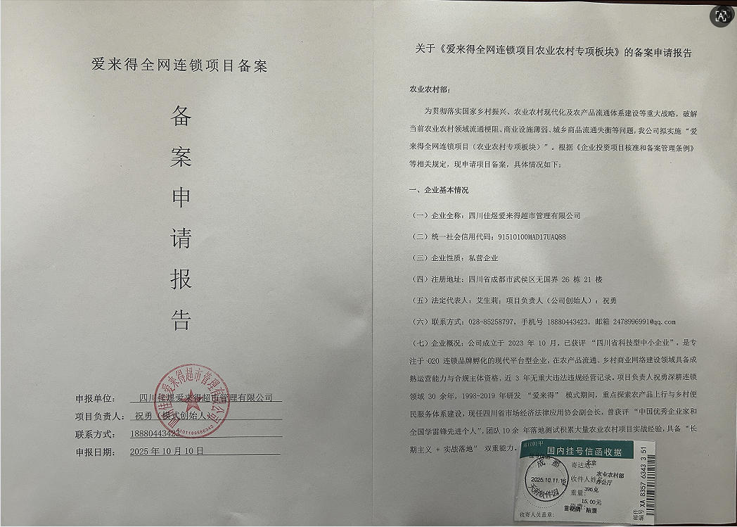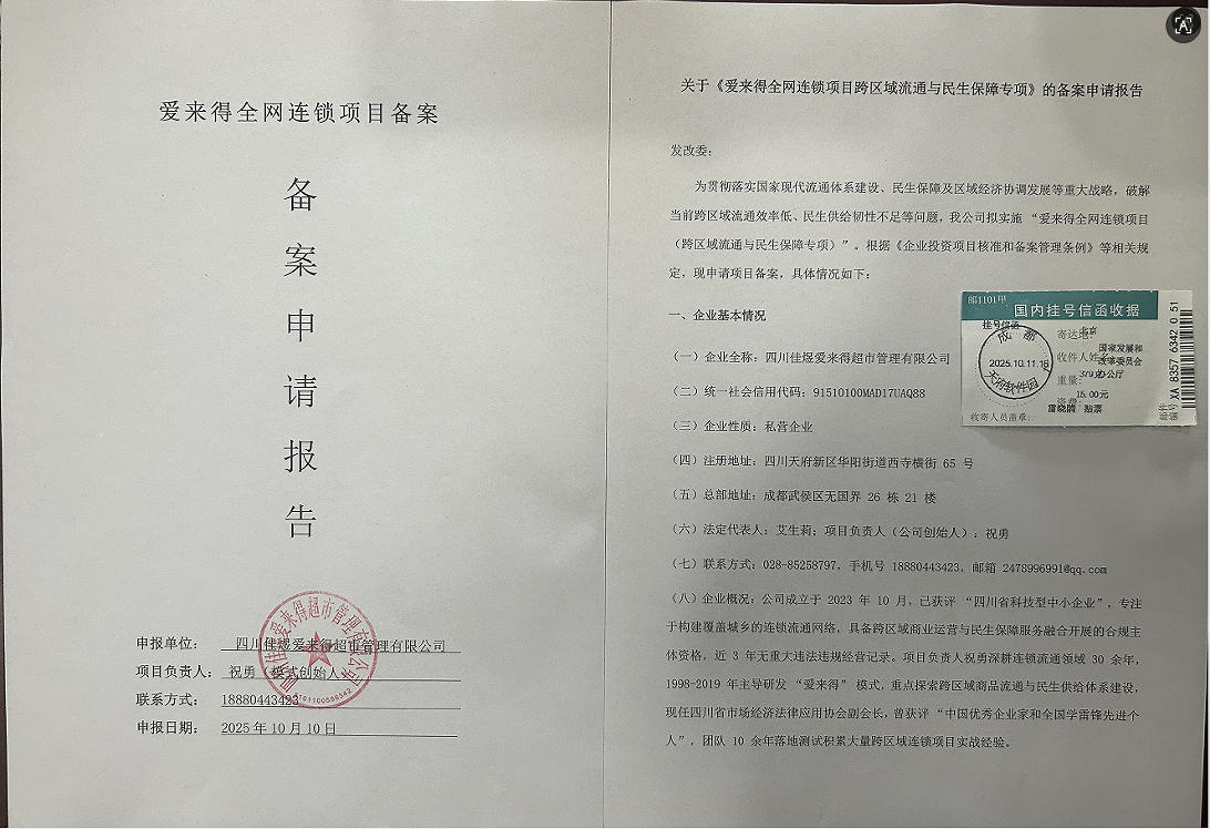 近日,四川佳煜爱来得超市管理有限公司向国家发改委、商务部、国务院、农业农村部等部门正式提交了 “爱来得全网连锁项目” 相关备案申请报告,这标志着爱来得全网连锁项目朝着规范化、规模化发展迈出了坚实一步。